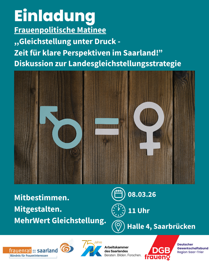 Da braucht es Räume sich zu treffen und über die Entwicklungen zu sprechen. Genau solch einen Raum wollen wir gemeinsam mit der Arbeitskammer des Saarlandes und dem DGB Rheinland-Pfalz/Saarland am 08. März um 11:00 Uhr in der Halle 4 in Saarbrücken bieten. Außerdem schauen wir gemeinsam auf die frauenpolitischen Entwicklungen im Saarland.