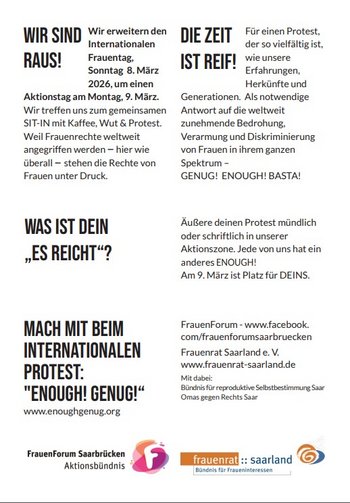 Der Frauenrat Saarland, beteiligt sich zusammen mit dem FrauenForum Saarbrücken den Omas gegen Rechts Saar und dem Bündnis für reproduktive Selbstbestimmung Saar mit der Aktion “Pause und Protest”, bei der Passantinnen in der Bahnhofstraße eingeladen werden, sich eine Pause zu nehmen und verbal oder kreativ auszudrücken, in welchen Lebensbereichen sie von Benachteiligungen aufgrund ihres Geschlechtes betroffen sind. Sie können ihre Wut, ihre Frustration, ihren Protest und ihre Ideen für mehr Gleichberechtigung äußern.