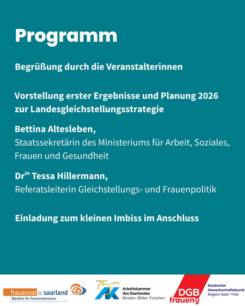 Da braucht es Räume sich zu treffen und über die Entwicklungen zu sprechen. Genau solch einen Raum wollen wir gemeinsam mit der Arbeitskammer des Saarlandes und dem DGB Rheinland-Pfalz/Saarland am 08. März um 11:00 Uhr in der Halle 4 in Saarbrücken bieten. Außerdem schauen wir gemeinsam auf die frauenpolitischen Entwicklungen im Saarland.