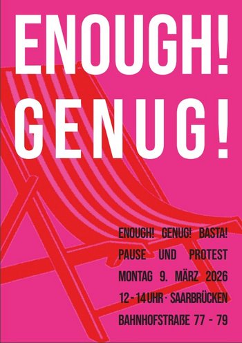 Der Frauenrat Saarland, beteiligt sich zusammen mit dem FrauenForum Saarbrücken den Omas gegen Rechts Saar und dem Bündnis für reproduktive Selbstbestimmung Saar mit der Aktion “Pause und Protest”, bei der Passantinnen in der Bahnhofstraße eingeladen werden, sich eine Pause zu nehmen und verbal oder kreativ auszudrücken, in welchen Lebensbereichen sie von Benachteiligungen aufgrund ihres Geschlechtes betroffen sind. Sie können ihre Wut, ihre Frustration, ihren Protest und ihre Ideen für mehr Gleichberechtigung äußern.